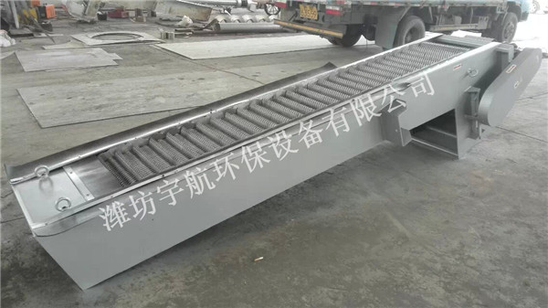 耙齒鏈運(yùn)轉(zhuǎn)到設(shè)備的上部時(shí),由于槽輪和彎軌的導(dǎo)向,使每組耙齒之間產(chǎn)生相對(duì)自清運(yùn)動(dòng),絕大部分固體物質(zhì)靠重力落下。另一部分則依靠清掃器的反向運(yùn)動(dòng)把粘在耙齒上的雜物清掃干凈。